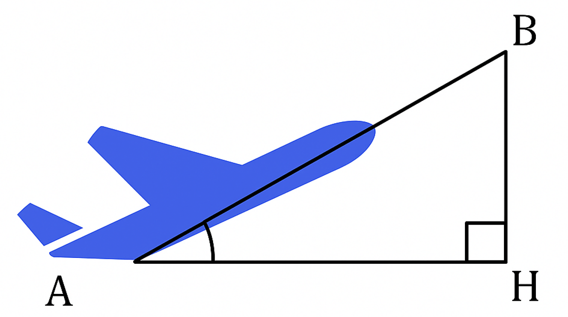 Một máy bay bay lên với vận tốc $500\, km/h$, sau 1,2 phút máy bay cách mặt đất 5km. Hỏi đường bay lên của máy bay tạo với phương nằm ngang một góc bao nhiêu độ?