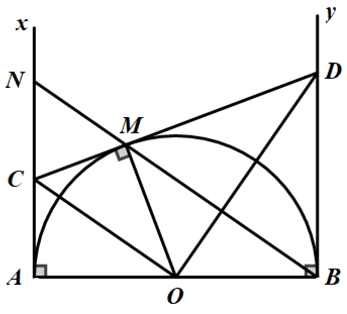 Cho nửa đường tròn tâm $O$ có đường kính $AB = 2R$. Gọi $Ax,By$ là các tia vuông góc với $AB\,\,(Ax,By$ và nưa đường tròn thuộc cùng một nửa mặt phẳng bờ $AB)$. Qua điểm $M$ thuộc nửa đường tròn ($M$ khác $A$ và $B$), kẻ tiếp tuyến với nửa đường tròn, cắt $Ax,By$ theo thứ tự tại C và D.