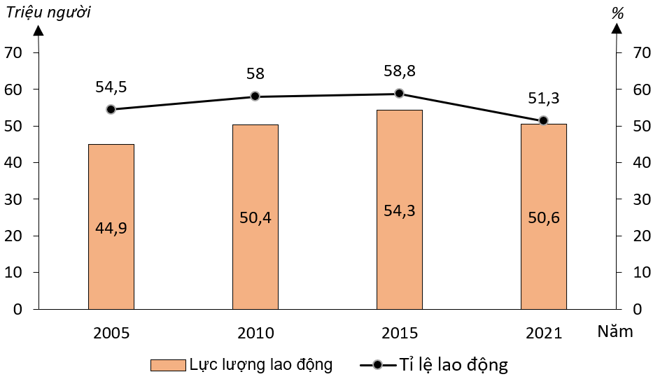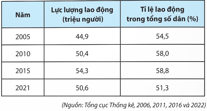 b) - Dựa vào biểu đồ/bảng số liệu để nhận xét về sự thay đổi lực lượng lao động và tỉ lệ lao động từ 15 tuổi trở lên so với số dân cả nước giai đoạn 2005 – 2021.