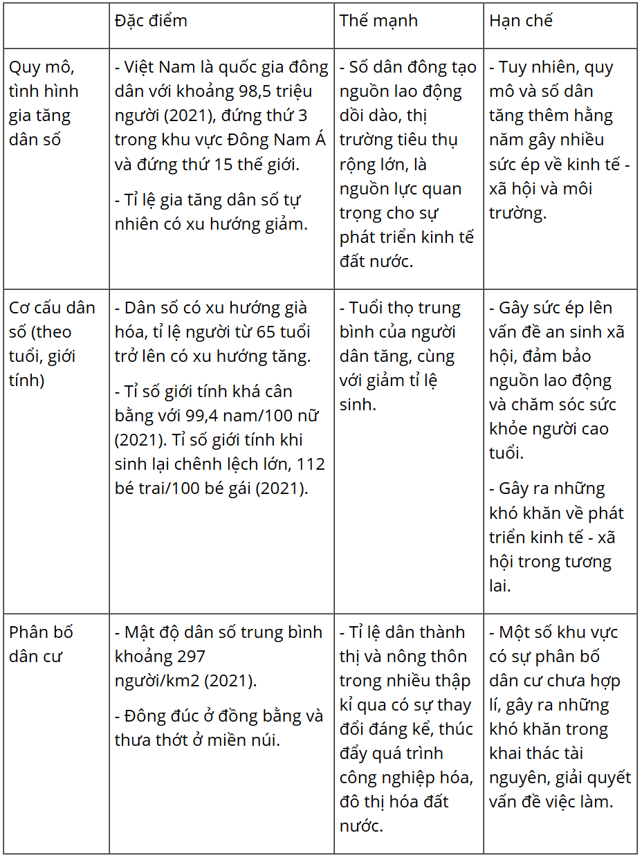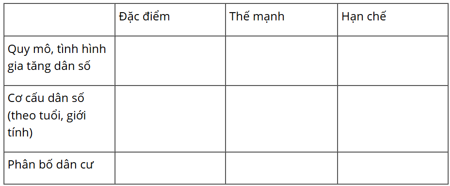 Hoàn thành thông tin về đặc điểm, thế mạnh và hạn chế của dân số nước ta vào bảng dưới đây.