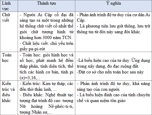 Lập bảng tìm hiểu thành tựu tiêu biểu của nền văn minh Ai Cập thời cổ đại theo gợi