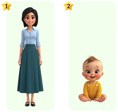 Với mỗi nhân vật trong bức hình dưới đây, em hãy viết 2-3 câu văn để miêu tả ngoại hình của nhân vật đó.