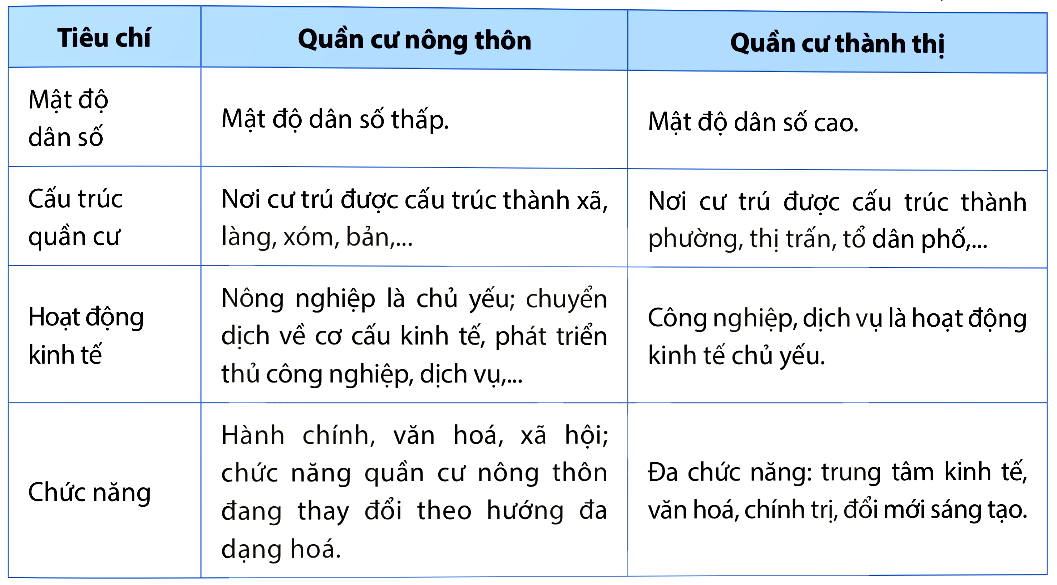 So sánh sự khác nhau giữa quần cư nông thôn và quần cư thành thị.