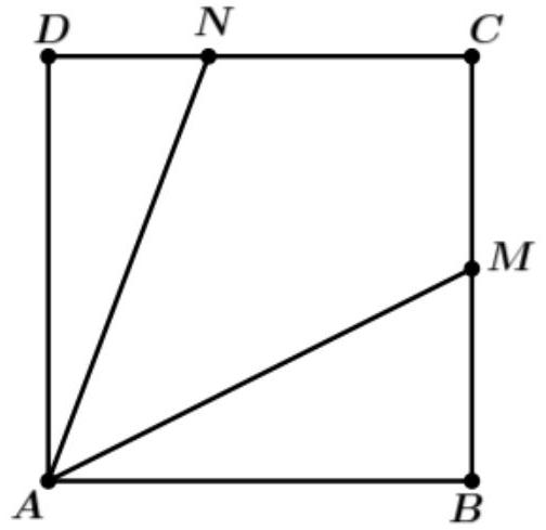 Trên một mảnh đất hình vuông $ABCD$ bác An đặt một chiếc đèn pin tại vị trí $A$ chiếu chùm sáng phân kì sang phía góc $C$. Bác An nhận thấy góc chiếu sáng của đèn pin giới hạn bởi hai tia $AM$ và $AN$ mà ở đó các điểm $M \in BC;N \in DC$ sao cho $BM = \dfrac{1}{2}BC,DN = \dfrac{1}{3}DC$. Góc chiếu sáng của đèn pin bằng bao nhiêu độ?