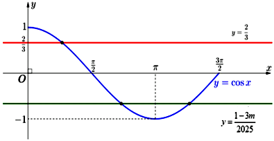 Bài toán thoả mãn khi phương trình $\text{cos}x = \dfrac{1 - 3m}{2025}$ có hai nghiệm phân biệt khác $x_{0}$ thuộc khoảng $\left\lbrack {0;\dfrac{3\pi}{2}} \right\rbrack$.