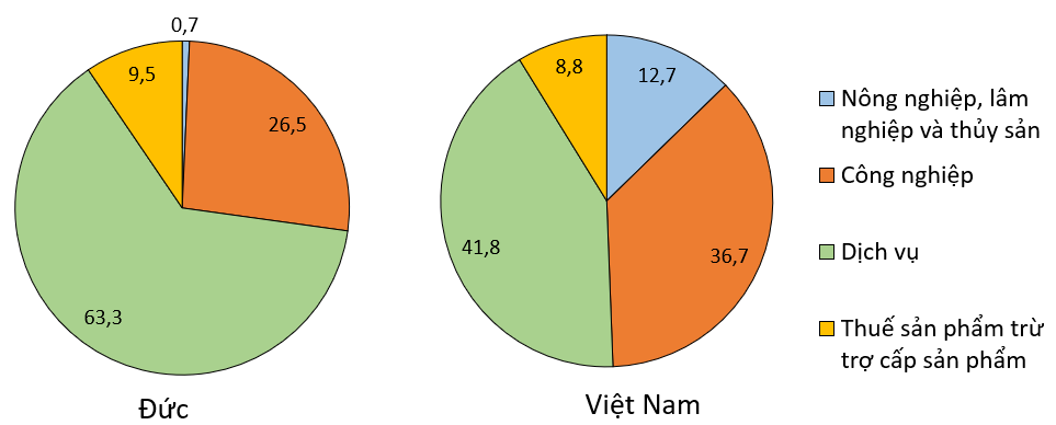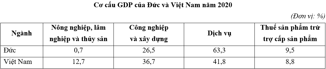 Cho bảng số liệu:a) Vẽ biểu đồ thể hiện cơ cấu GDP của Đức và Việt Nam năm 2020.b) Nhận