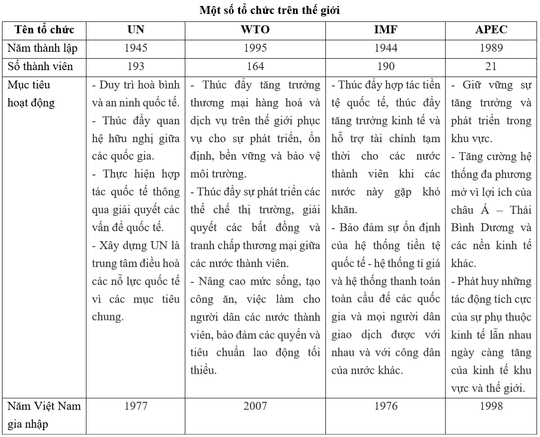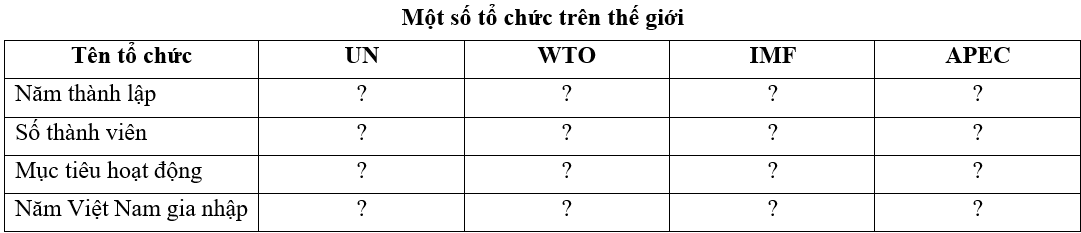 Dựa vào một số tổ chức quốc tế và khu vực và điền vào bảng tương ứng.