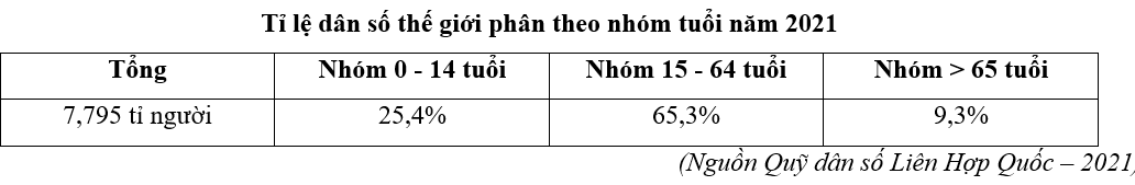 Cho bảng số liệu: Căn cứ vào bảng số liệu trên, hãy cho biết số dân nhóm tuổi 0 – 14 tuổi