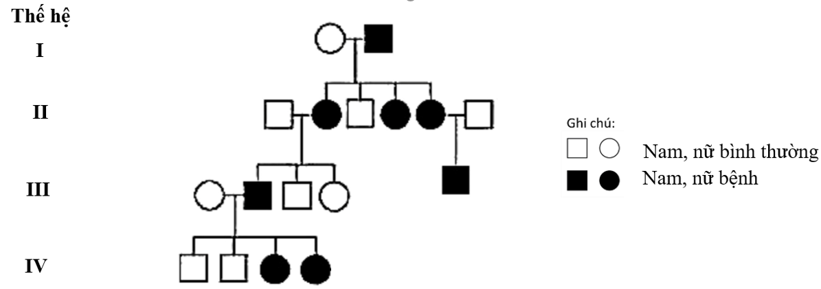 Phả hệ dưới đây biểu thị sự di truyền của một loại bệnh đục thủy tinh thể trong một gia đình. Bệnh này do một gene nằm trên nhiễm sắc thể X quy định.