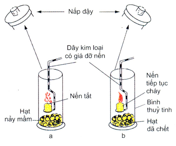 | b) Thí nghiệm chứng minh quá trình hô hấp ở thực vật đã tiêu thụ O₂ và ảnh hưởng đến sự cháy của ngọn nến. | ||