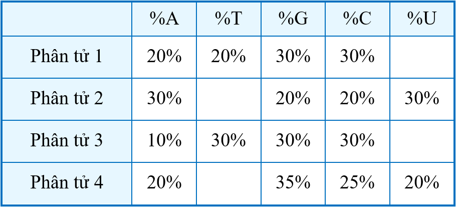 Phân tích thành phần của 4 nucleic acid cho thấy tỉ lệ các loại nucleotide như sau: