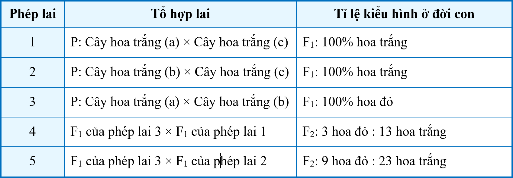 | d) Nếu cho cây F1 của phép lai 1 tự thụ phấn thì đời con có tỉ lệ kiểu hình là 100% hoa trắng. |