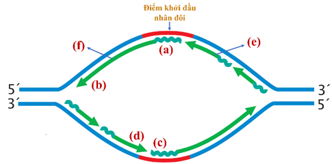 | b) Sợi DNA mới tổng hợp (e) là mạch dẫn đầu, (f) là mạch theo sau. | ||