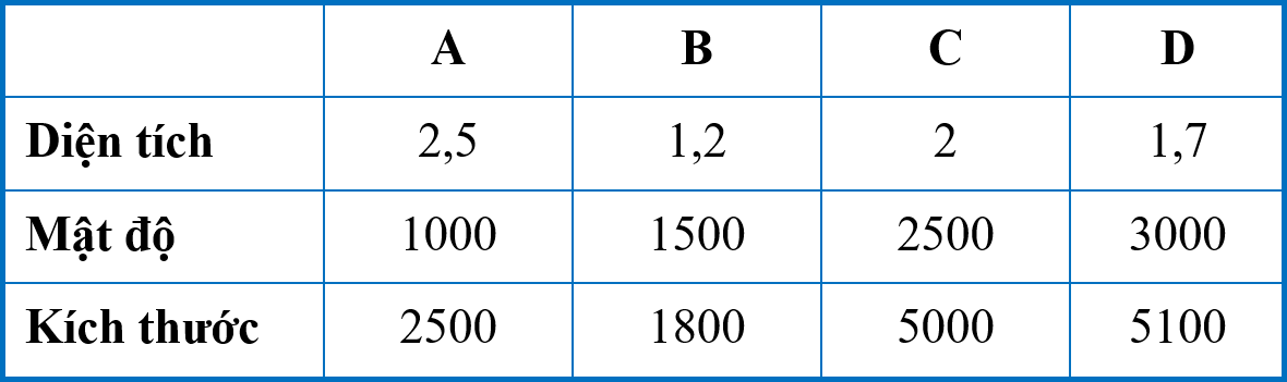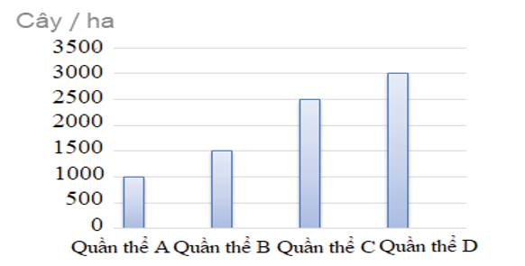 Hình sau mô tả khu vực phân bố và mật độ của 4 quần thể cây thuộc 4 loài khác nhau trong một khu vực sống có diện tích 10 ha (tại thời điểm t). Biết diện tích phân bố của 4 quần thể A, B, C, D lần lượt là 2,5 ha; 1,2 ha; 2 ha; 1,7 ha. Quần thể có kích thước lớn nhất chênh lệch bao nhiêu cá thể so với quần thể có kích thước nhỏ nhất?