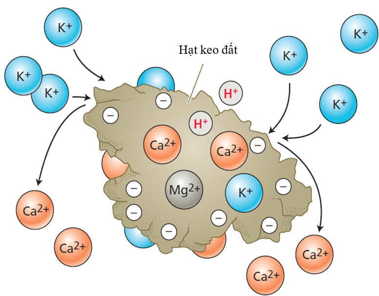 Hình bên dưới mô tả cơ chế trao đổi cation trên bề mặt hạt keo đất. Bề mặt hạt keo mang điện tích âm nên nó có thể hút các ion mang điện tích dương (cation). Quá trình trao đổi cation giúp duy trì sự cân bằng dinh dưỡng trong đất, đảm bảo cây trồng tiếp cận được các ion cần thiết như K⁺, Ca²⁺, và Mg²⁺.