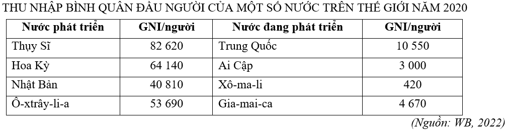 | a) Nước phát triển có GNI/người lớn hơn nhiều lần nước đang phát triển. | ||