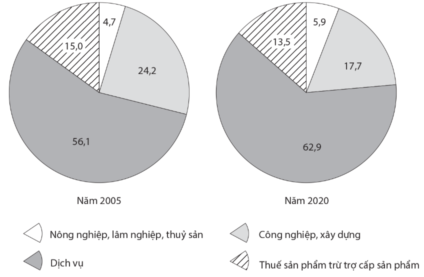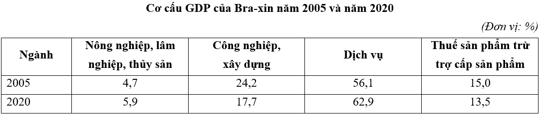 Cho bảng số liệu:a) Vẽ biểu đồ thể hiện cơ cấu GDP của Bra-xin năm 2005 và năm 2020.b) Nhận