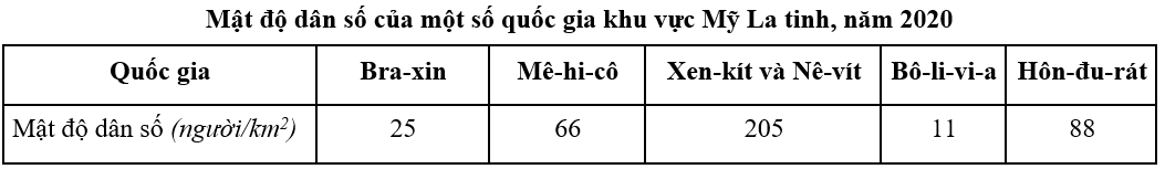 Cho bảng số liệu: Căn cứ vào bảng số liệu trên, hãy cho biết mật độ dân số của quốc gia