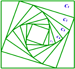 Cho hình vuông $\left( C_{1} \right)$ có cạnh bằng 4 cm. Người ta chia mỗi cạnh của hình vuông thành 4 phần bằng nhau và nối các điểm chia một cách thích hợp để được hình vuông $\left( C_{2} \right)$ như hình vẽ. Từ hình vuông $\left( C_{2} \right)$ lại tiếp tục như trên để được hình vuông $\left( C_{3} \right),\ldots$ tiếp tục như trên, hỏi độ dài của cạnh hình vuông thứ 10 là bao nhiêu? (kết quả làm tròn đến hàng phần trăm)