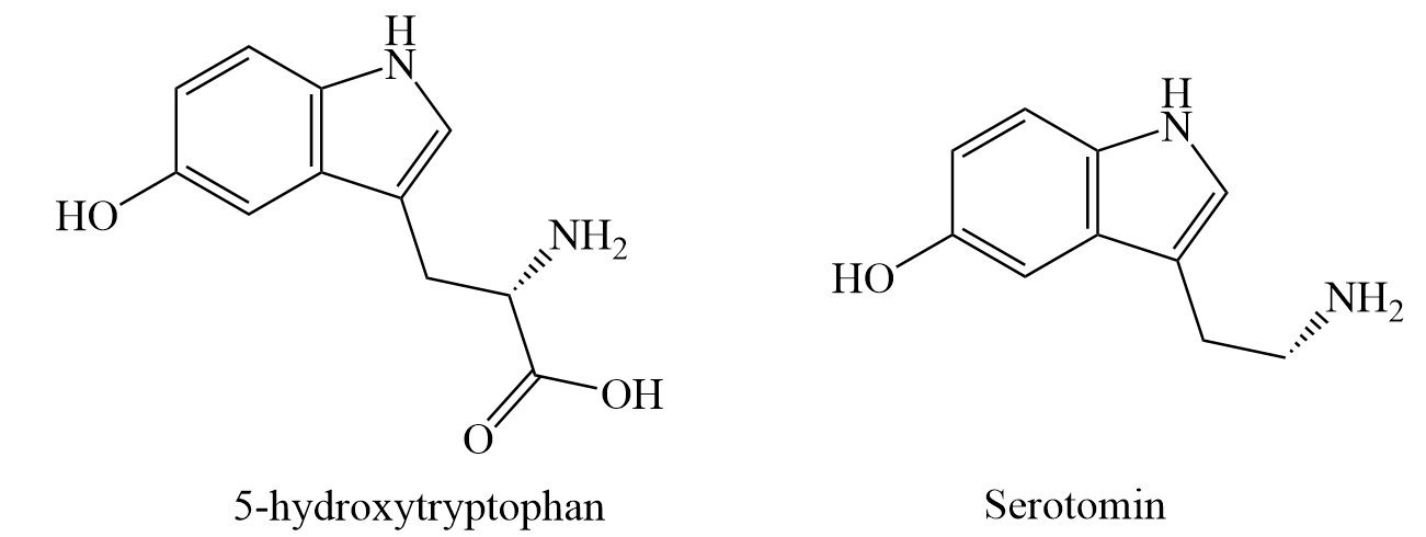 b) Sau khi cơ thể hấp thụ tryptophan từ thức ăn, enzyme tryptophan hydroxylase sẽ hydroxyl hóa tryptophan thành chất 5-Hydroxytryptophan. Sau đó 5-Hydroxytryptophan chuyển hóa thành serotonin. Serotonin là một hormone truyền tín hiệu giữa các tế bào thần kinh. Phân tích cấu trúc xác định được serotonin không chứa nhóm –COOH, vẫn còn nhóm –NH₂ và nhóm –OH phenol, khối lượng phân tử của serotonin là 176. Viết công thức cấu tạo của 5-Hydroxytryptophan và serotonin.