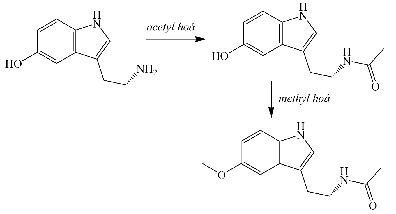 d) Một số nghiên cứu chỉ ra rằng hormone melatonin giúp cải thiện hiệu quả giấc ngủ. Melatonin được tạo thành từ sự chuyển hóa serotonin. Serotonin được enzyme AANAT (arylalkylamine N-acetyltransferase) acetyl hóa thành N-acetylserotonin. Phân tích biết được N-acetylserotonin vẫn chứa vòng indole và chứa nhóm –NH–CO–CH₃, có khối lượng phân tử là 218. Sau đó N-acetylserotonin được methyl hoá thành melatonin bởi enzyme ASMT (acetylserotonin O-methyltransferase). Phân tích cấu trúc melatonin, xác định được melatonin chứa nhóm –OCH₃ liên kết với vòng indole và vẫn chứa nhóm –NH–CO–CH₃. Xác định công thức cấu tạo của N-acetylserotonin và melatonin.