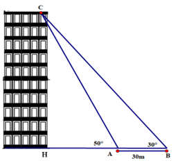 Hai người dân đứng cách nhau $30m$ cùng nhìn lên đỉnh của một tòa nhà theo góc nhìn lần lượt là $30{^\circ}$ và $50{^\circ}$ (tham khảo hình vẽ):