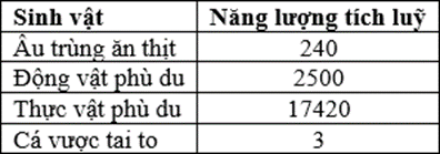 Khảo sát một hệ sinh thái nước ngọt, người ta ghi nhận năng lượng tích lũy được của 4