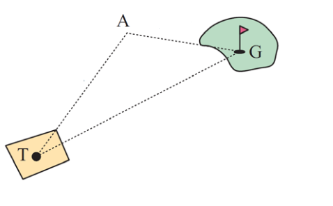 Một người chơi gôn thực hiện cú phát bóng với khoảng cách $220\, m$ từ điểm phát bóng tới điểm A. Sau đó, anh ấy dùng gậy số $6$ thực hiện cú đánh tới lỗ gôn với khoảng cách $165\, m$. Nếu khoảng cách từ điểm phát bóng đến lỗ gôn là $340\, m$, tính góc tạo bởi đường thẳng nối điểm phát bóng tới lỗ gôn với đường phát bóng của anh ấy (kết quả làm tròn đến hàng đơn vị).