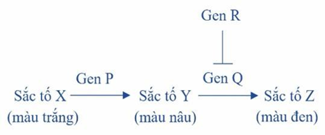 Một loài chuột thuộc họ Muridae, sắc tố tạo nên màu lông được quy định bởi ba gene P, Q và R nằm trên 3 nhiễm sắc thường khác nhau. Mỗi gene trên đều có hai allele, trong đó các allele lặn (p, q, r) không tạo thành protein chức năng. Các gene này điều hoà sự tổng hợp sắc tố thông qua con đường sinh tổng hợp được minh hoạ ở sơ đồ bên (dấu