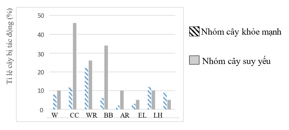 | b) Nai sừng tấm (EL), châu chấu ăn lá (LH) và bọ cánh cứng ăn vỏ cây (BB) là nguyên nhân chủ yếu gây chết cây dương. | ||