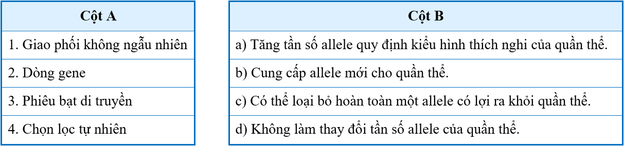 Cho các nhân tố tiến hóa ở cột A và tác động của chúng đến cấu trúc di truyền của quần thể ở cột B trong bảng dưới đây: