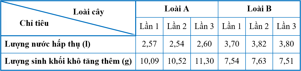 Các nhà khoa học đã sử dụng hai loài cây A và B (một loài thực vật C3 và một loài thực vật C4) để so sánh giữa hai loài về mối liên hệ giữa nhu cầu nước và lượng chất khô tích lũy trong cây. Sau cùng một thời gian sinh trưởng, các giá trị trung bình về lượng nước hấp thụ và lượng sinh khối khô tăng thêm được thống kê sau 3 lần lặp lại thí nghiệm và thể hiện trong bảng. Biết rằng, các cây thí nghiệm được trồng trong điều kiện canh tác tối ưu, giống nhau về độ tuổi và khối lượng tươi (tương quan với sinh khối khô).