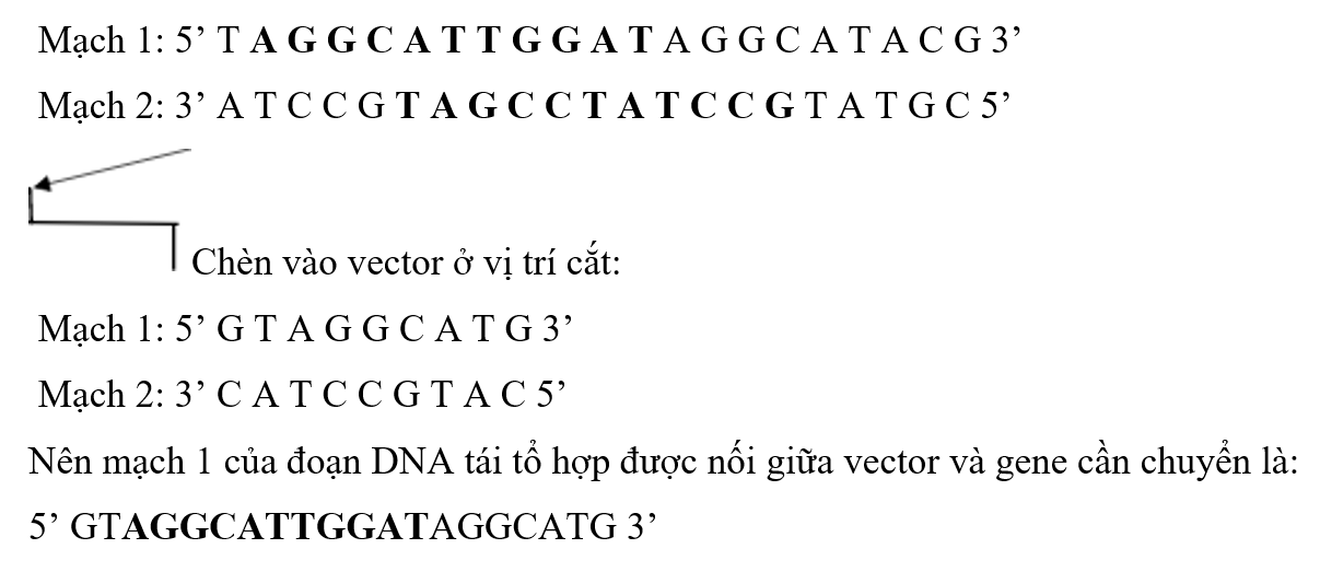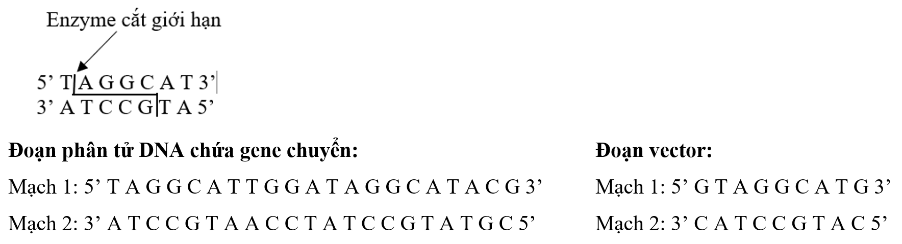 Cho enzyme cắt giới hạn có các trình tự nhận biết đặc trưng tương ứng; đoạn phân tử DNA chứa gene cần chuyển và vector đều có trình tự nhận biết cho enzyme cắt giới hạn.