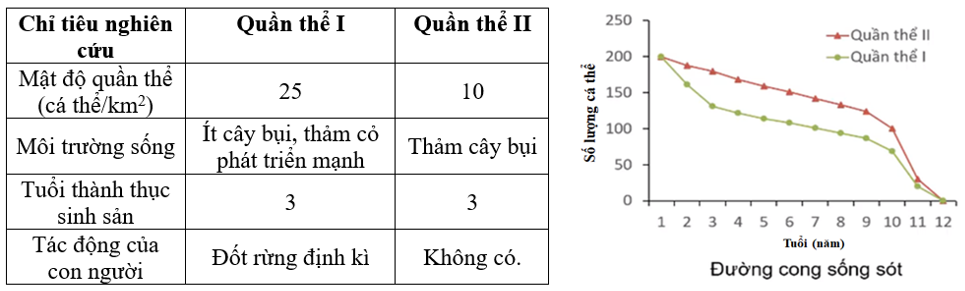 | a) Tỉ lệ sống sót của quần thể I thấp hơn của quần thể II. | ||