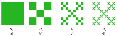 Bắt đầu hằng một hình vuông $H_{0}$ cạnh bằng 1 đơn vị độ dài (xem Hình 6a). Chia hình vuông $H_{0}$ thành chín hình vuông bằng nhau, bỏ đi bốn hình vuông, nhận được hình $H_{1}$ (xem Hình 6b). Tiếp theo, chia mỗi hình vuông của $H_{1}$ thành chín hình vuông rồi bỏ đi bốn hình vuông, nhận được hình $H_{2}$ (Hình c). Tiếp tục quá trình này, ta nhận được một dãy hình $H_{n}\left( {n = 1,2,3,\ldots} \right)$.