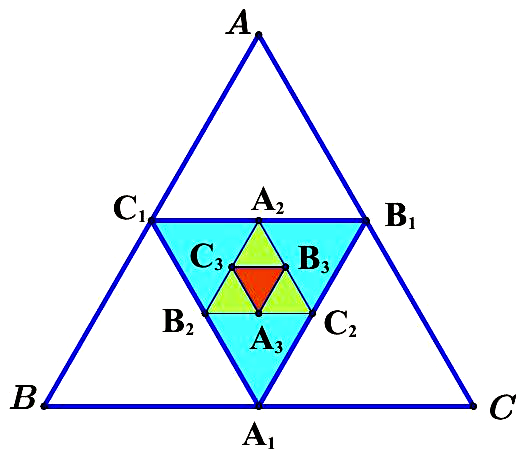 | b) Biết rằng tam giác đều có cạnh bằng $a$ thì có diện tích là $\dfrac{a^{2}\sqrt{3}}{4}$. Diện tích tam giác $A_{3}B_{3}C_{3}$ là: $S_{3} = \dfrac{\sqrt{3}}{64}$. | ||