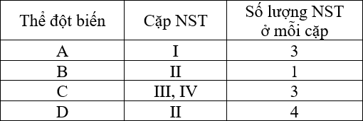 Lúa nước (Oryza sativac) có bộ NST 2n = 24. Khi phân tích bộ NST của một số tế bào của các thể đột biến A, B, C, D người ta thu được số lượng NST bất thường ở một số cặp NST (I, II, III, IV), các cặp NST còn lại đều bình thường (Bảng).