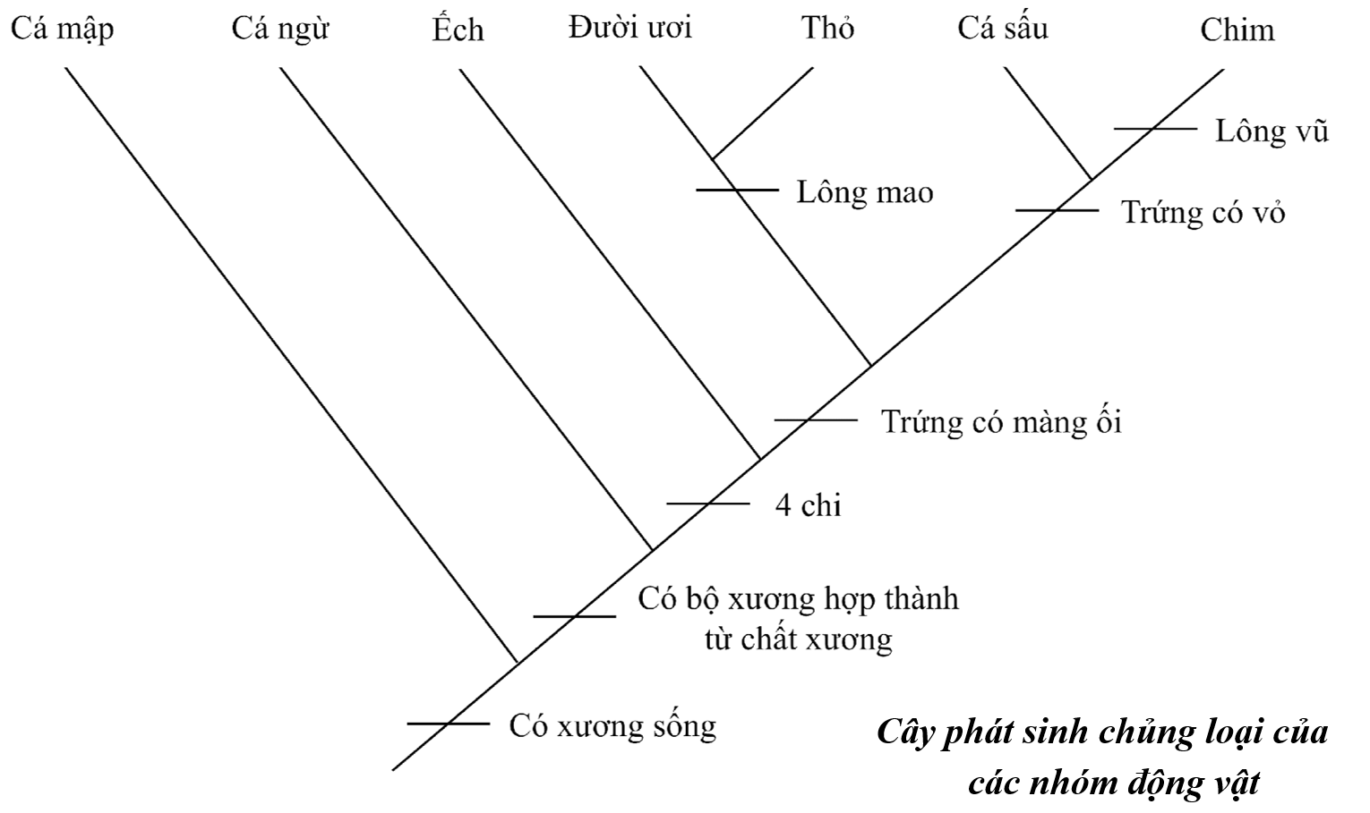 Mối quan hệ tiến hoá giữa các loài trong cây phát sinh chủng loại ở hình bên, chứng minh sự phát sinh chủng loại là kết quả của quá trình tiến hoá. Biết rằng những đặc điểm tổ tiên chung tồn tại ở tất cả các loài trong cùng một nhánh, đặc điểm phát sinh mới đặc trưng cho các nhánh riêng.