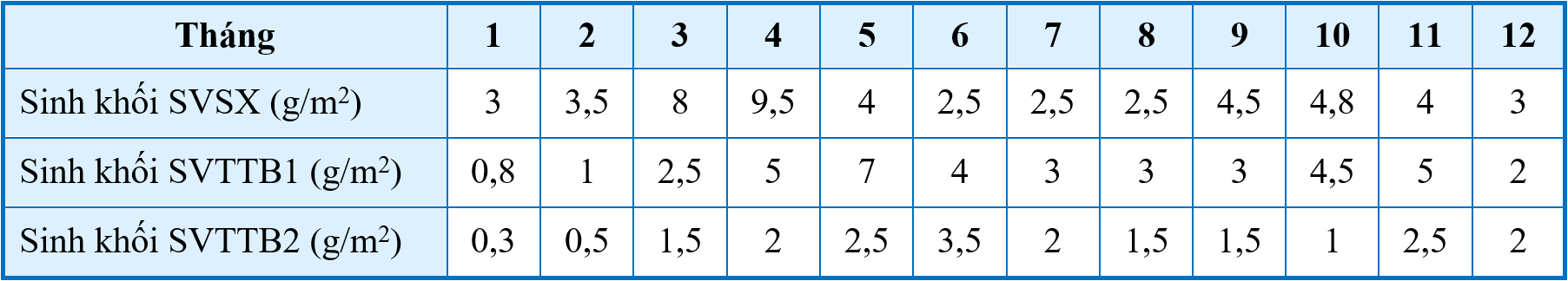 Một hệ sinh thái vườn quốc gia Sierra Nevada (Tây Ban Nha), các nhà khoa học nghiên cứu sinh khối của các nhóm sinh vật ở Bắc bán cầu gồm các nhóm sinh vật: Sinh vật sản xuất (SVSX), sinh vật tiêu thụ bậc 1 (SVTTB1), sinh vật tiêu thụ bậc 2 (SVTTB2) như bảng sau. Cho biết, khu vực này chịu ảnh hưởng sâu sắc của yếu tố mùa.