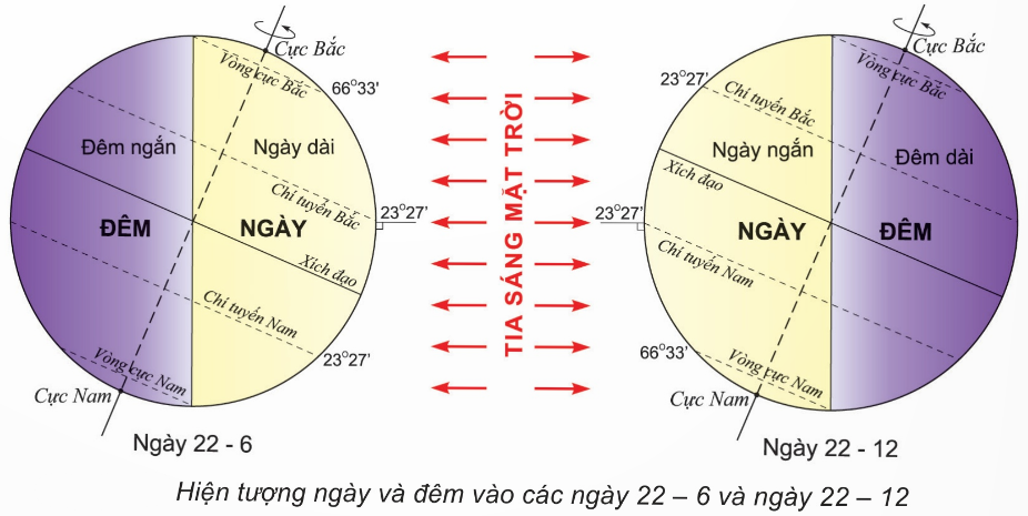 Dựa vào sơ đồ và nội dung hệ quả chuyển động của Trái Đất quanh Mặt Trời (phần hiện tương ngày đêm dài ngắn khác nhau).