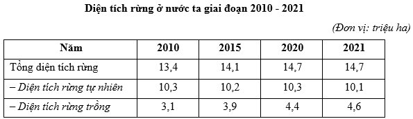 d) Dựa vào sự thay đổi diện tích rừng trồng và diện tích rừng tự nhiên trong giai đoạn 2010 – 2021.