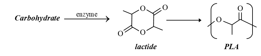 Poly (lactic acid) (PLA) là một loại polymer phân hủy sinh học đang được nghiên cứu phát triển nhằm giải quyết các vấn đề môi trường liên quan đến rác thải nhựa. Một số loại vật liệu PLA sẽ trở nên giòn, dễ vỡ vụn khi gặp nhiệt độ khoảng 65°C đến 72°C và bị phân hủy bởi nhiệt ở nhiệt độ khoảng 160°C. PLA được sản xuất bằng quá trình lên men carbohydrate theo sơ đồ dưới đây: