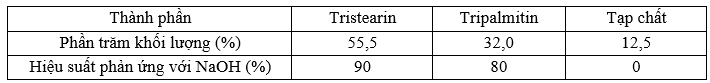 Một loại chất béo có chứa tristearin, tripalmitin. Phần trăm khối lượng các chất có trong chất béo và hiệu suất phản ứng xà phòng hóa chất béo này bằng dung dịch NaOH được cho ở bảng sau: