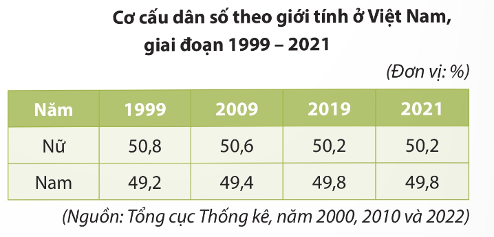 Lấy tỉ trọng dân số nữ năm 1999 trừ tỉ trọng dân số nữ năm 2021.