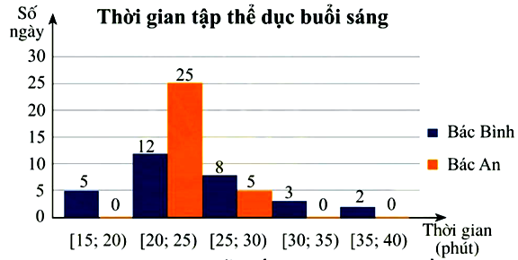Biểu đồ dưới đây thống kê thời gian tập thể dục buổi sáng mỗi ngày trong tháng $9/2022$ của bác Bình và bác An.