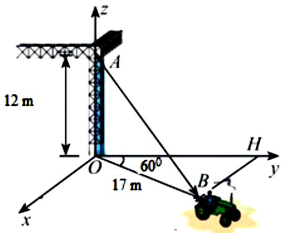 Một chiếc xe đang kéo căng sợi dây cáp $AB$ trong công trường xây dựng. Trên đó đã thiết lập hệ toạ độ $Oxyz$ như hình vẽ với độ dài đơn vị trên các trục tọa độ bằng 1 m. Biết $OB = 17\text{m}$, $OA = 12m$ và $\widehat{HOB} = 60^{\circ}$. Giả sử tọa độ của vectơ $\overset{\rightarrow}{AB} = \left( {a;b;c} \right)$, tính $P = b + c$.