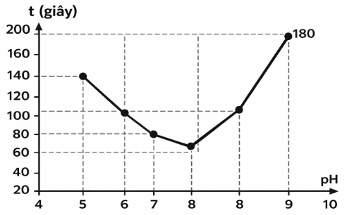 • Bước 3: Sau khoảng mỗi 10 giây, dùng ống hút lấy 1-2 giọt hỗn hợp phản ứng trong ống nghiệm và cho vào đĩa sứ chứa sẵn dung dịch iodine, quan sát để từ đó xác định thời gian tinh bột thủy phân hết. Lặp lại thí nghiệm theo ba bước trên, chỉ thay đổi pH dung dịch trong Bước 1 lần lượt là 6; 7; 8; 9. Nhóm học sinh ghi lại kết quả thời gian t (giây) mà tinh bột thủy phân hết trong môi trường pH = 5; 6; 7; 8; 9 và vẽ đồ thị như hình bên dưới.