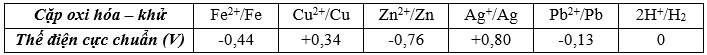 Cho bảng giá trị thế điện cực chuẩn của các cặp oxi hóa – khử như sau: