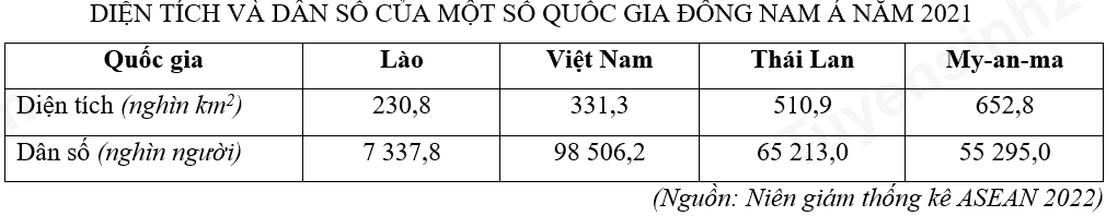 Dựa vào bảng số liệu, hãy chọn nhận xét đúng về đặc điểm diện tích và dân số của một số quốc gia Đông Nam Á năm 2021?