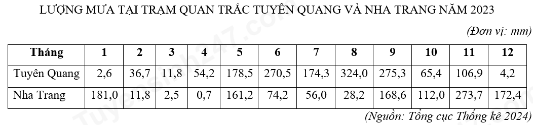Dựa vào bảng số liệu, hãy cho biết chênh lệch tổng lượng mưa của Tuyên Quang so với tổng lượng mưa của Nha Trang năm 2023 là bao nhiêu mm (làm tròn kết quả đến hàng đơn vị)?